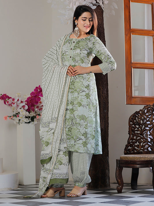 Elegant Green Leaf-Printed Cotton Kurta Set