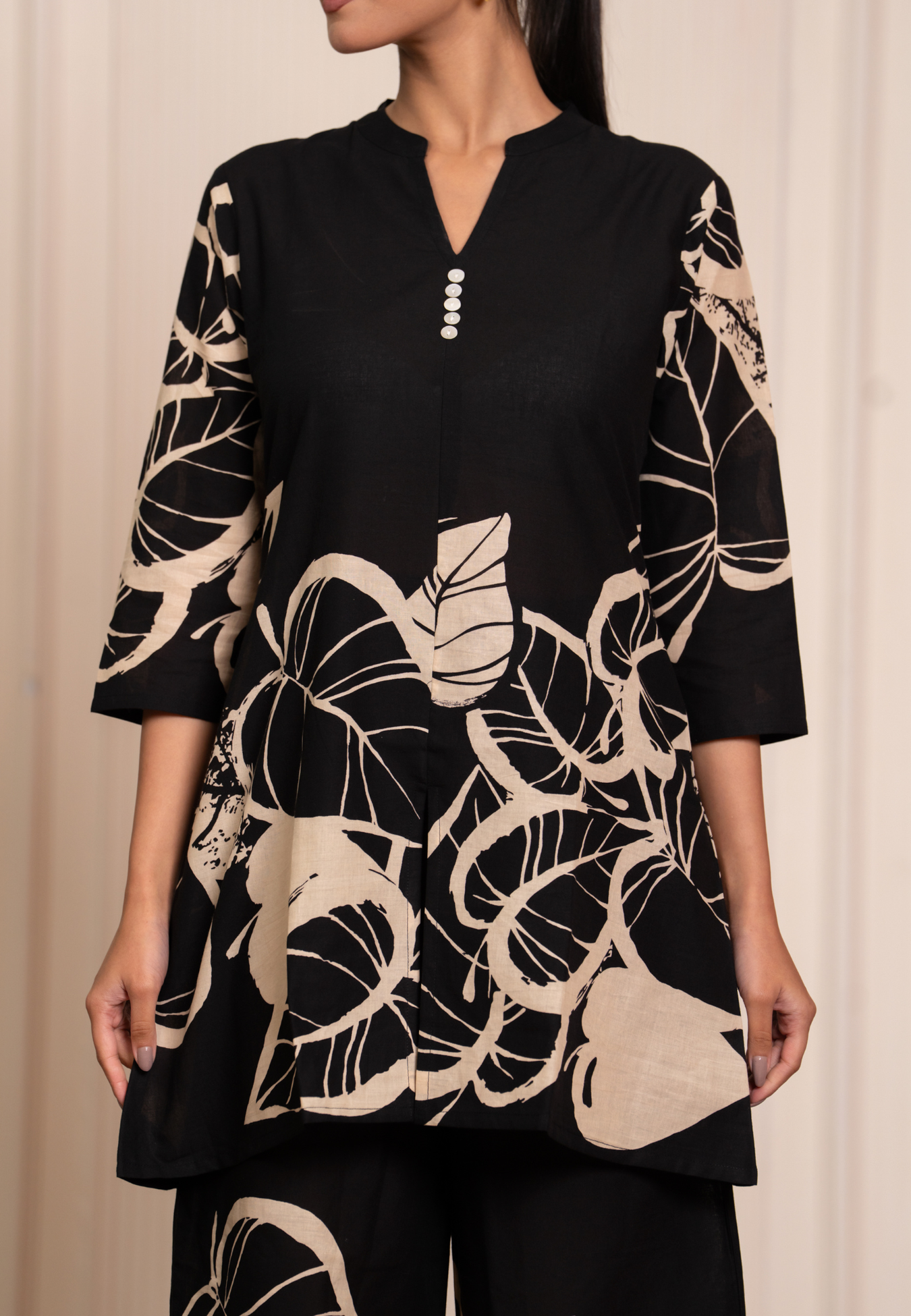 Classic Black Co-Ord Set with Bold Beige Leaf Prints