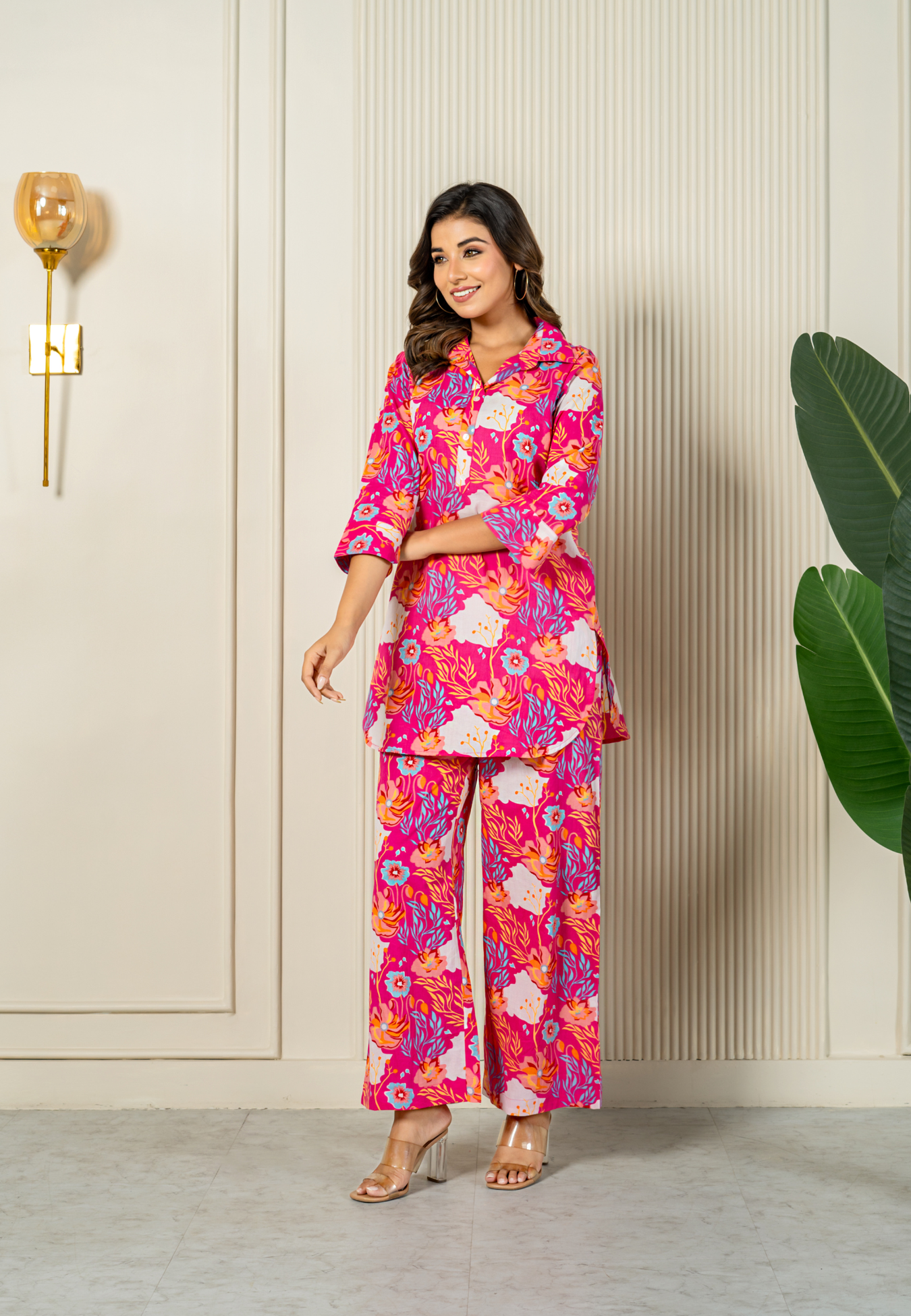This Hot Pink cotton loungewear co-ord set for women boasts a playful yet refined design. The set includes a collared top with three buttons, providing a touch of elegance to your relaxation time. Made from soft, breathable cotton, it ensures comfort and style for lounging at home or casual outings.