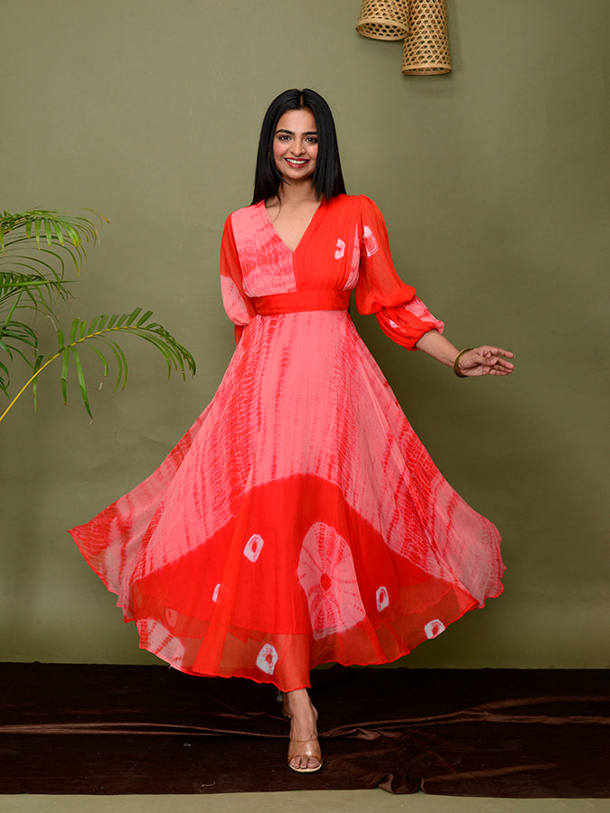 Pamper yourself in festivities and celebrations in this colorful stunner. The shades of red make it so timeless. The sleeves add to the magic. The fit and flared silhouette is the perfect party essential.