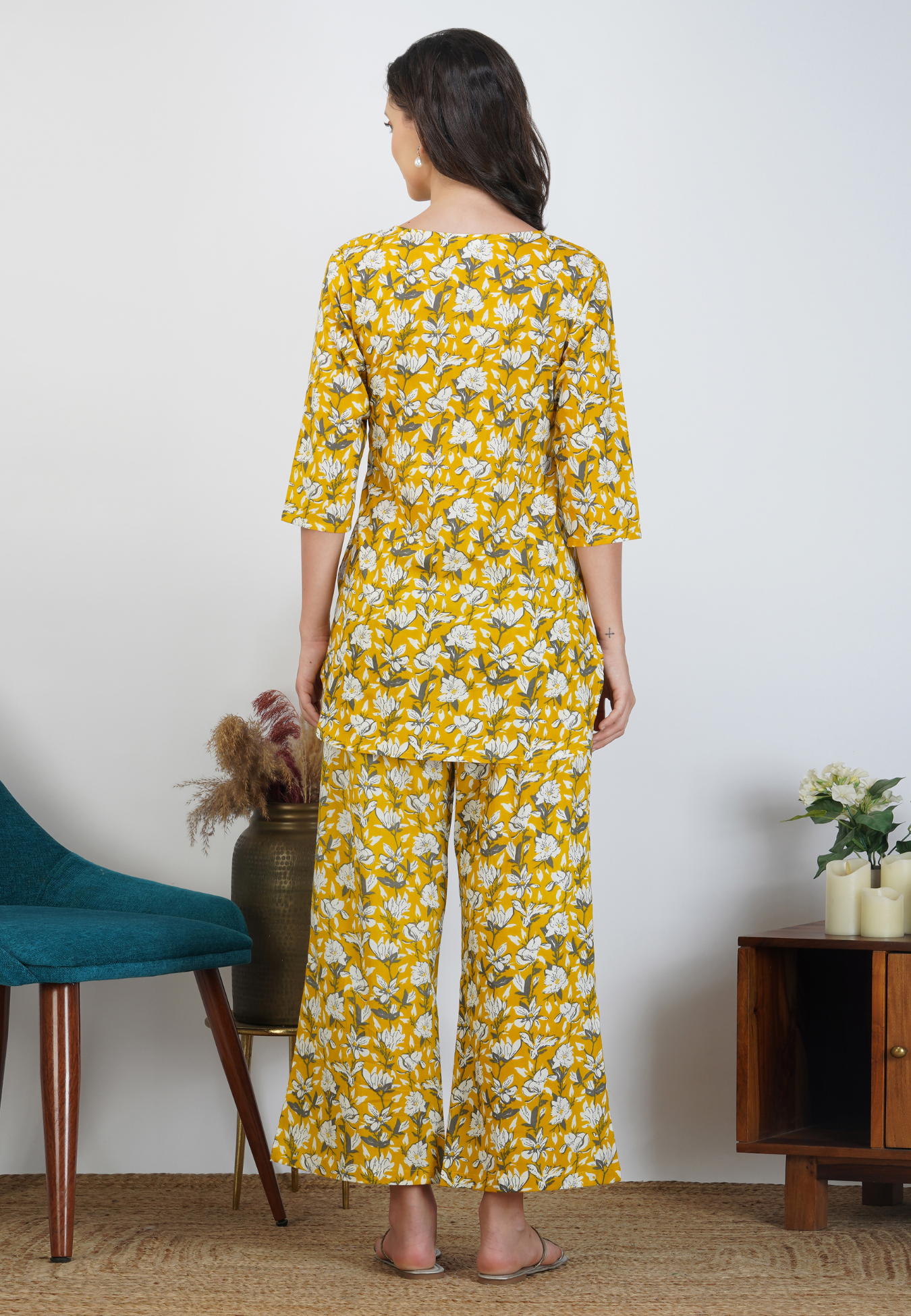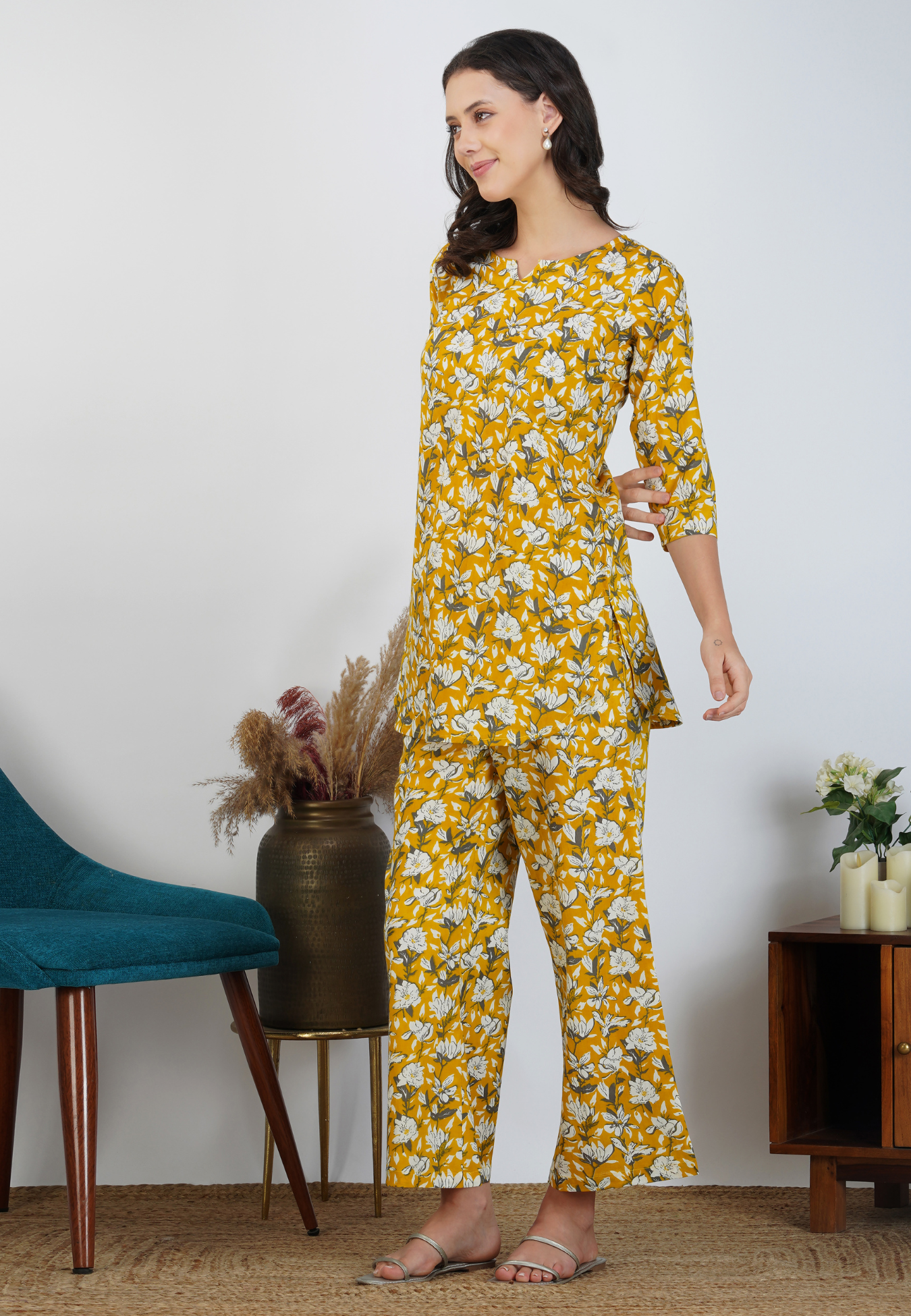 Experience comfort with style in our Yellow Elegance Cotton Loungewear. Crafted with premium cotton, this collection features a delicate floral design on a cheerful yellow base. Perfect for relaxing at home or casual outings, these pieces blend classic elegance with laid-back charm.