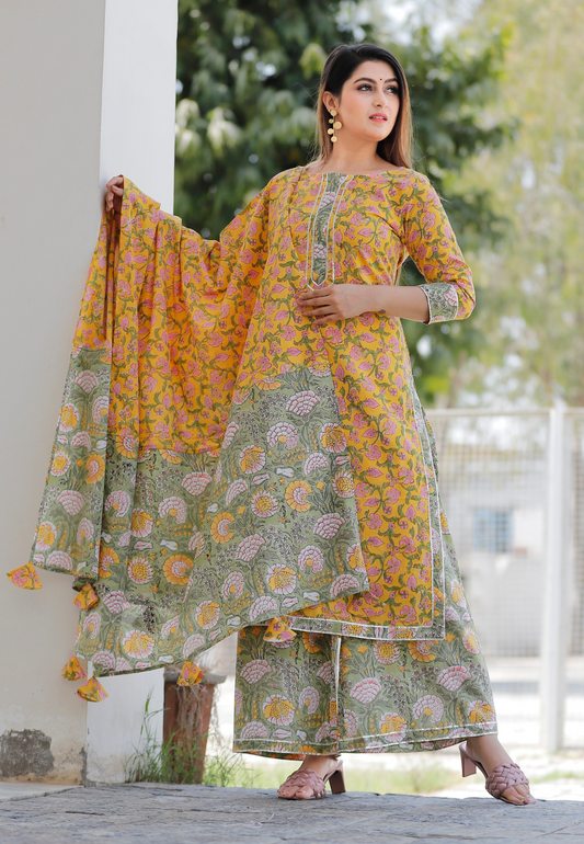 Mustard Hand Block Printed Kurta Set