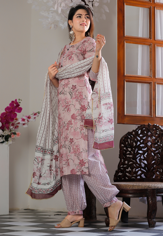 Cream Pink Floral Printed Suit Set